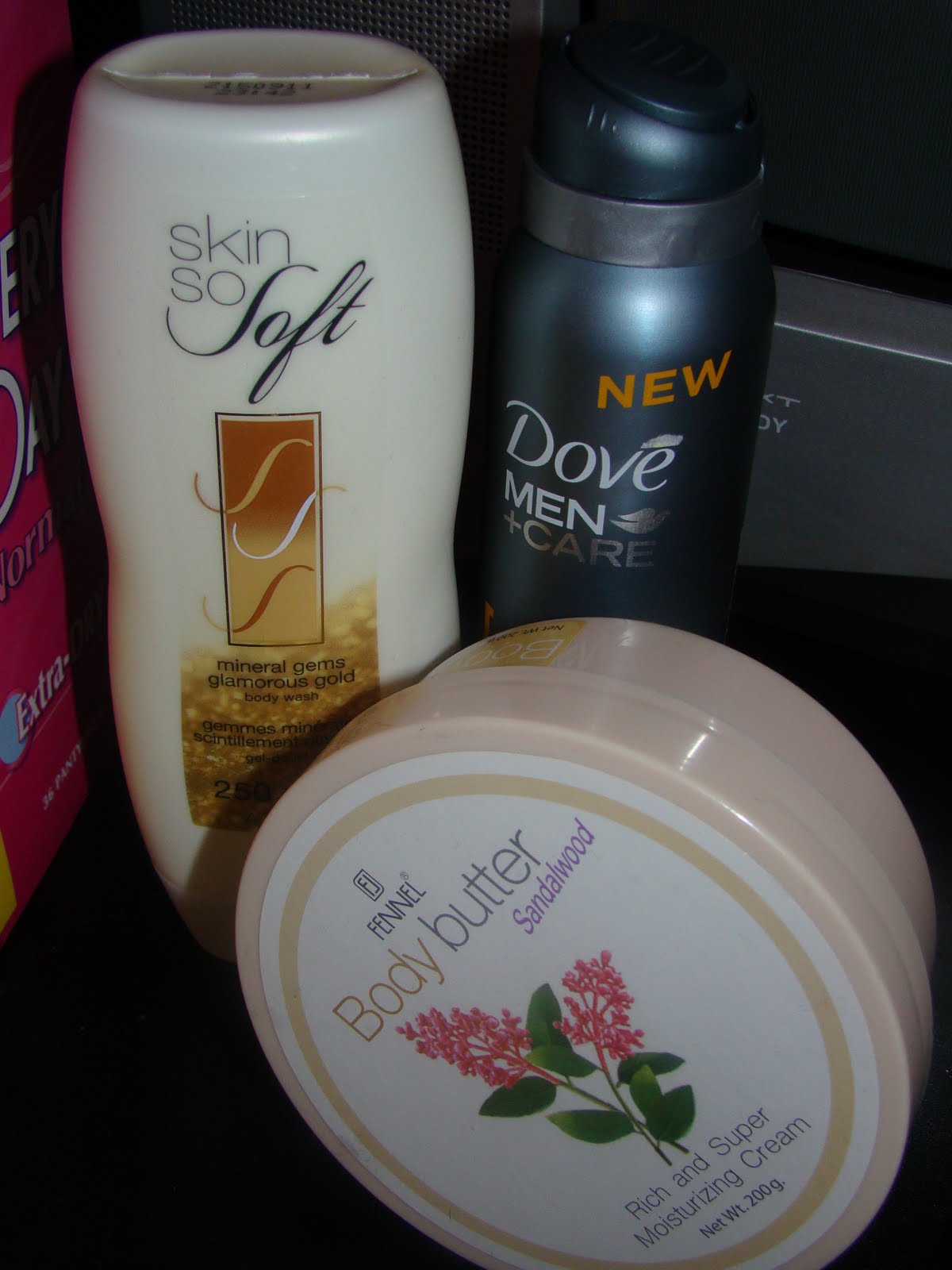- am folosit gelul de dus Skin so Soft de la Avon , cu particule stralucitoare . Mi-a placut , a avut o textura super cremoasa , imi mirosea bine pielea dupa el . Dar nici urma de vreo sclipire :)) Acum folosesc gel de dus de la Palmolive , cu ulei de masline . Am revenit la el , preferatul meu dintr-o mie :)